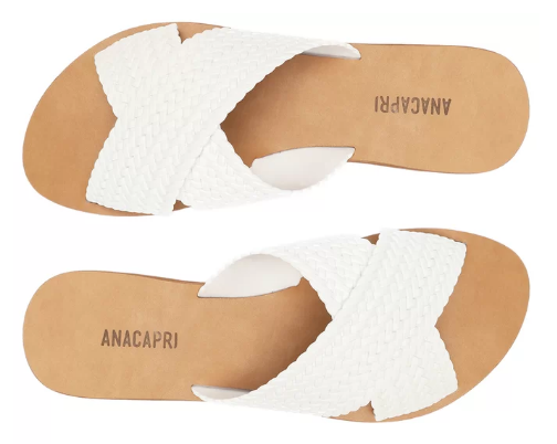 Rasteira ANACAPRI de plástico injetado na cor branca. Possui duas tiras cruzadas na gáspea com acabamento trançado. Palmilha marrom com o nome da marca, deixa dedos e calcanhar à mostra.