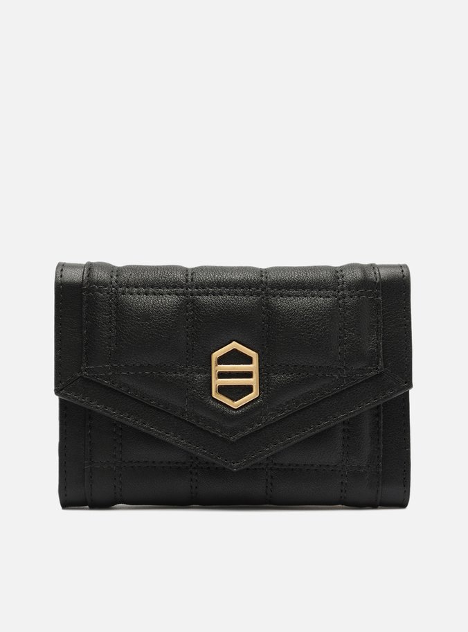 Descrição: Carteira preta média de couro. O acessório tem formato retangular e fecho em tampo envelope com botão, além de costuras em matelassê quadradas e aplicação de metal geométrico e vazado. Parte interna na cor da carteira com divisórias.