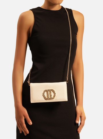 Descrição: Bolsa clutch pequena Off-white. O modelo tem formato estruturado e retangular e capas com textura tramada. Possui alça tiracolo removível em corrente, fecho interno em zíper com puxador e fecho externo em tampo com botão de pressão. Com porta-cartões na parte interna e aplicação metálica, geométrica e vazada com pedrarias na capa frontal.