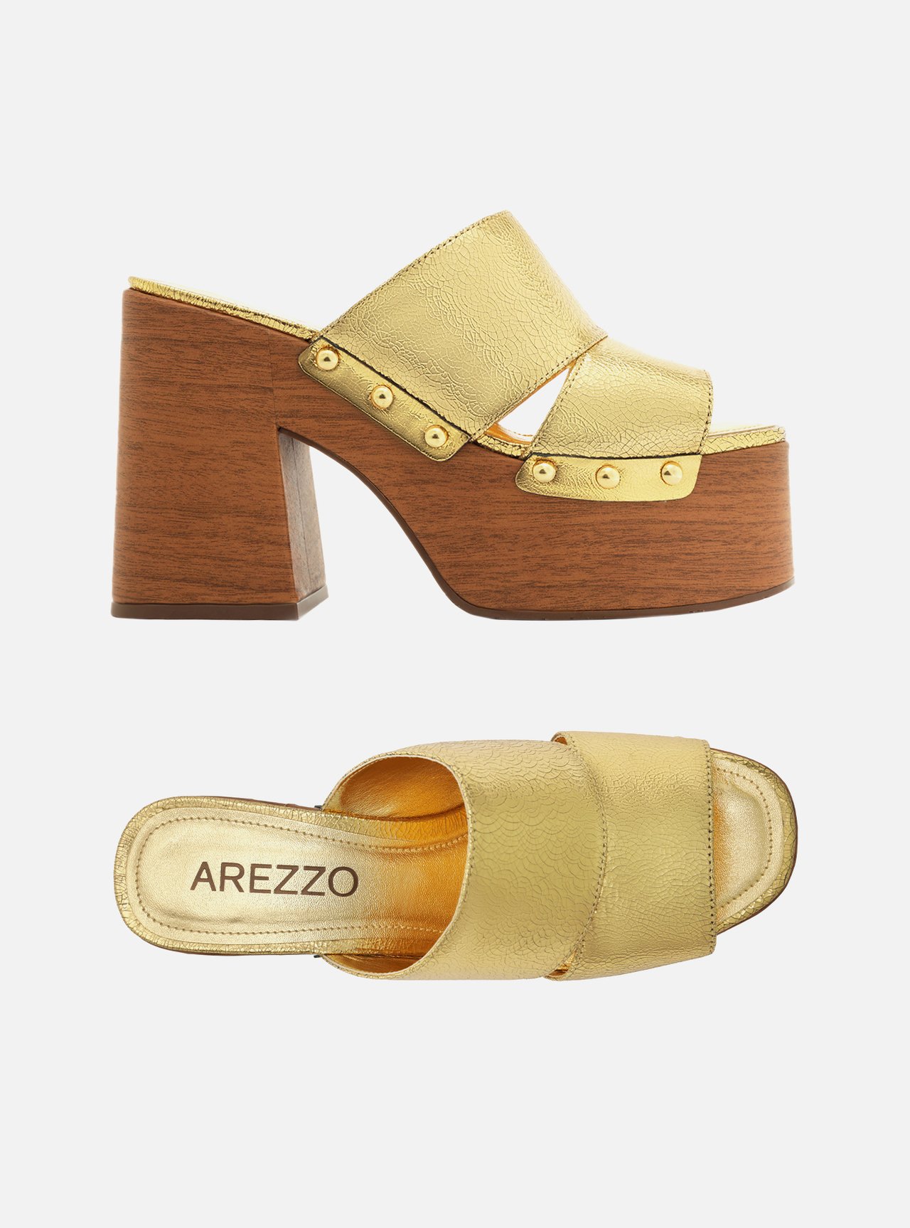 Sandália Dourada Couro Meia Pata Bloco Madeira