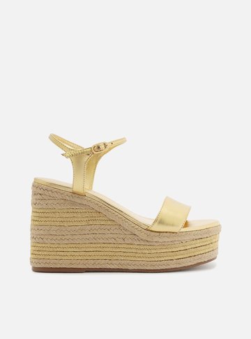 A plataforma traduz as tendências da temporada e aposta no mix do tom metalizado com a corda natural. Charmosa e despojada, é a escolha ideal para as produções frescas da estação. Combine com jeans e alfaiataria em tons neutros.