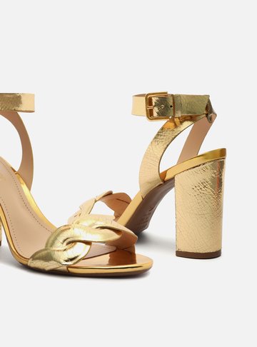 Descrição: Sandália dourada. O modelo tem salto alto bloco e bico redondo. Traz tiras estofadas e tramadas sobre os dedos. Possui tira média que sai das laterais, se cruza no calcanhar, contorna o tornozelo e fecha em fivela metálica. Com palmilha bege e inscrição do nome da marca. A sandália exibe todo o pé.