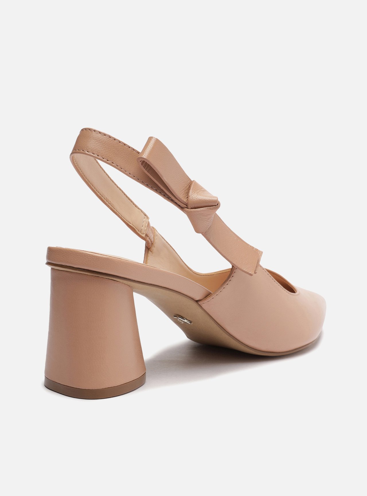 Descrição: Scarpin nude de couro. O modelo tem salto médio bloco, com formato arredondado, e bico fino. Fechado, traz cabedal com recorte redondo sobre o peito do pé e ajustado nas laterais. Aberto atrás, possui tira fina em torno do calcanhar com aplicação de tira em laço e palmilha com inscrição do nome da marca. Exibe todo o peito e parte traseira do pé.
