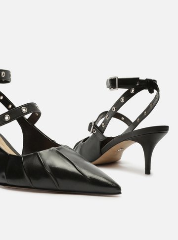 Scarpin Preto Couro Bico Fino Slingback Ilhós