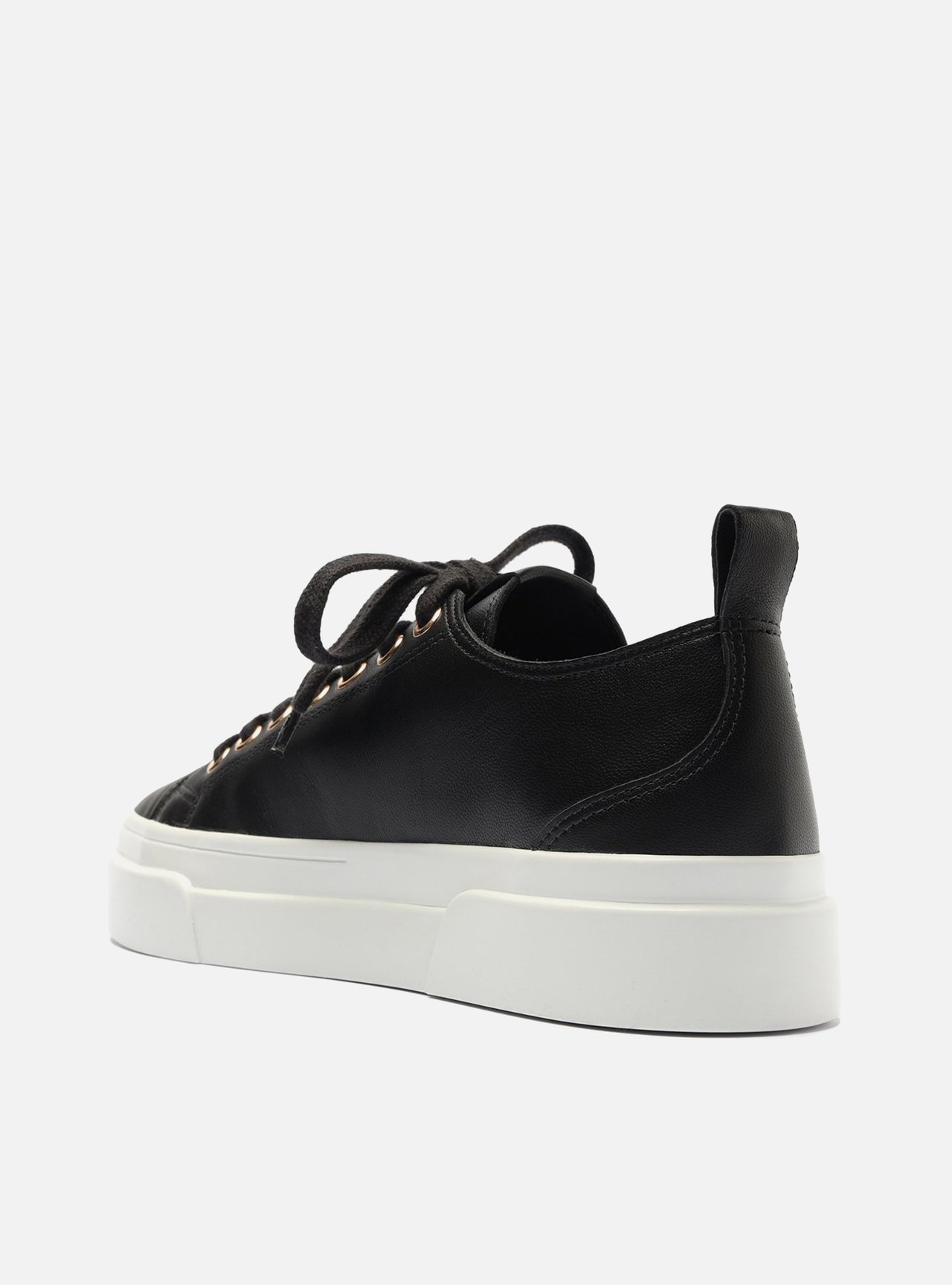 Descrição: Tênis preto de couro. O modelo de amarração tem solado flatform emborrachado branco e tira preta de couro no calcanhar, facilitando o calce. De bico redondo, o tênis tem biqueira emborrachada, fecho em cadarços da cor do tênis e tag do nome da marca na língua.